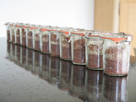 Was wäre wohl besser geeignet, um den Vergleich anzutreten, als mein persönlicher Kuchen aller Kuchen: der Schokoladekuchen. Dies v.a. auch deshalb, weil der einzige Unterschied zum Marronikuchen der ist, dass ich für dieses Gebäck eben Schokolade verwende statt Marronipüree, der Rest ist plusminus identisch. Wieso sollte der also nicht auch längere Zeit haltbar sein, so eingemacht im Weck-Glas?