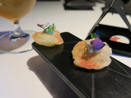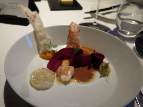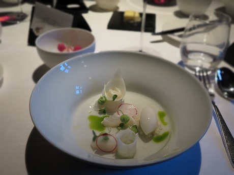 Die Orgie beginnt mit den Amuse bouches: anderthalb Stunden nach Ankunft hatten wir noch nicht mal den ersten Gang auf dem Tisch, uns aber in dieser Zeit an nicht weniger als zwölf verschiedenen Gaumenkitzlern gütlich getan, die uns eindrücklich vor Augen geführt haben, was Spitzengastronomie bedeutet. Bei beinahe allem, was uns präsentiert wurde, haben wir uns gefragt, wie man so etwas macht. Eine rote, gefrorene Kugel in Truffegrösse mit flüssigem Inhalt, bleistiftdünne Röhrchen gefüllt mit Sauerampfer-Paste, mit Gänseleber dünn eingepackte, aussen knallrot bestäubte Mandeln, ein Champignon-Sorbet, ein luftiges, wabbeliges Kartoffelsoufflée. Der normale Hobbykoch hat keinen Dunst oder kann nur rätseln, welche Techniken und Geräte hinter all dem stehen müssen, was für eine Fingerfertigkeit und Kompromisslosigkeit all diese kleinen Köstlichkeiten voraussetzen. Meiner Lebtage noch nie habe ich ein derartiges Spektrum an Konsistenzen, Gerüchen und Geschmäckern vorgesetzt bekommen, noch nie ein derartiges Spektakel für die Augen genossen – immer serviert natürlich im passenden Geschirr, auf einem gekühlten Plättchen, auf einer Porzellan-Bank oder auch auf Steinen.