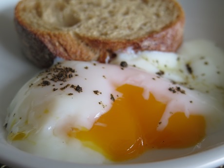 Seit einiger Zeit beginnt sich nun auch noch die japanische Spielart der Eierzubereitung auszubreiten – eben dieses Onsen-Ei. Was das ist? Ein Ei, das während langer Zeit genau bei derjenigen Temperatur gehalten wird, bei der das Eigelb zu denaturieren beginnt, und die liegt bei 65° bis 68°C. Lässt man es während 50 bis 60 Minuten bei dieser Temperatur im Wasser, so ist es nicht mehr flüssig, aber auch noch nicht fest. Öffnet man nach dieser Prozedur das Ei, gleitet es aus der Schale, schneidet man es an, so ist das Eigelb geléeartig, glänzt und lässt sich verformen, wie sich in obigem Bild erkennen lässt. Wollte man mit diesem Onsen-Ei authentisch verfahren, würde man nur das Eigelb essen. Ich wüsste aber nicht, wieso man das Eiklar verschmähen sollte.