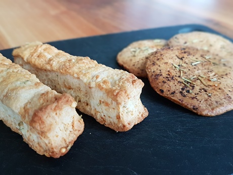 - Gewürzte Apérocrackers: dem Wähenteig (s. oben) pro 100 g Teig 1 g Salz und einen gestrichenen Espressolöffel getrocknete Kräuter (Rosmarin, Thymian, Majoran, Oregano) zugeben. Zu einer Rolle mit 3 – 4 cm Durchmesser aufrollen, schmale Scheiben abschneiden, bei 180°C Ofentemperatur ca. 20 bis 25 Minuten goldbraun backen.