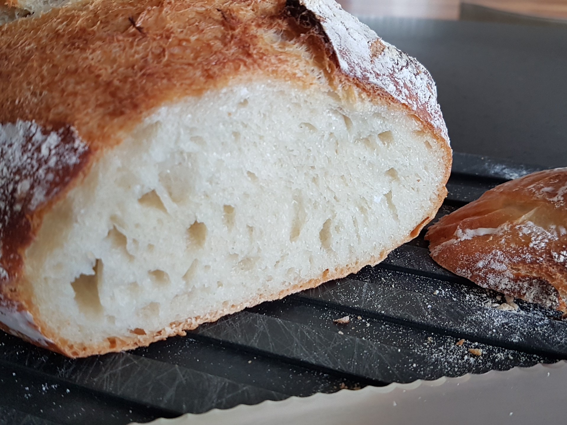 Nachdem dieser erste Versuch schon recht ansprechend herausgekommen, das Brot jedoch – wohl aufgrund des hohen Wasseranteils – für meinen Geschmack zu salzarm war, habe ich tags darauf gleich noch ein zweites nachgeschoben, mit angepassten Mengen. Die üblichen 2% der Mehlmenge in Salz habe ich auf 3% erhöht, die Hefemenge bei 1% der Mehlmenge festgelegt, die Wassermenge bei 80%. Ob mit dieser Formel auch bei einem anderen Mehl (Dinkel, Ruchmehl, etc.) ein so schmackhaftes und knuspriges Brot rauskommt? Keine Ahnung, selber probieren.