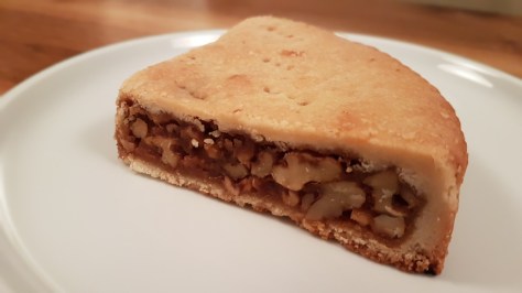 Etwas mehr Fingerspitzengefühl als das Original verlangte dann der Teig beim Verarbeiten: Er war viel brüchiger, bzw. die richtige Temperatur musste nach dem Kühlschrankgang abgewartet werden, bis er geschmeidig genug war, um ihn in die Form zu drücken. Positiv überrascht war ich dann, wie schön goldbraun er beim Backen geworden war. Und ebenso positiv überrascht war ich, wie fein sie schmeckt. Der Honig in der Füllung fehlt mir nicht, bloss der Buttermürbeteig schmeckt nach meinem Dafürhalten besser. Andere wiederum – nicht nur Veganer – fanden die vegane Variante besser als das Original. Fazit: Ist wider Erwarten doch was geworden, die vegane Variante der Bündner Nusstorte.