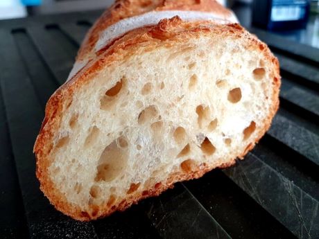 Seit ich das neue Rezept verwende und diese Beobachtung gemacht habe, ist die heimische Baguette-Produktion wieder sprunghaft angestiegen. Ich habe wohl schon einige Dutzend nach der 24-Stunden-Methode gemacht, immer gleich zwei aufs Mal, stelle sie jedoch je nach zur Verfügung stehender Zeit auch mal wieder nach der 48-Stunden-Methode her.