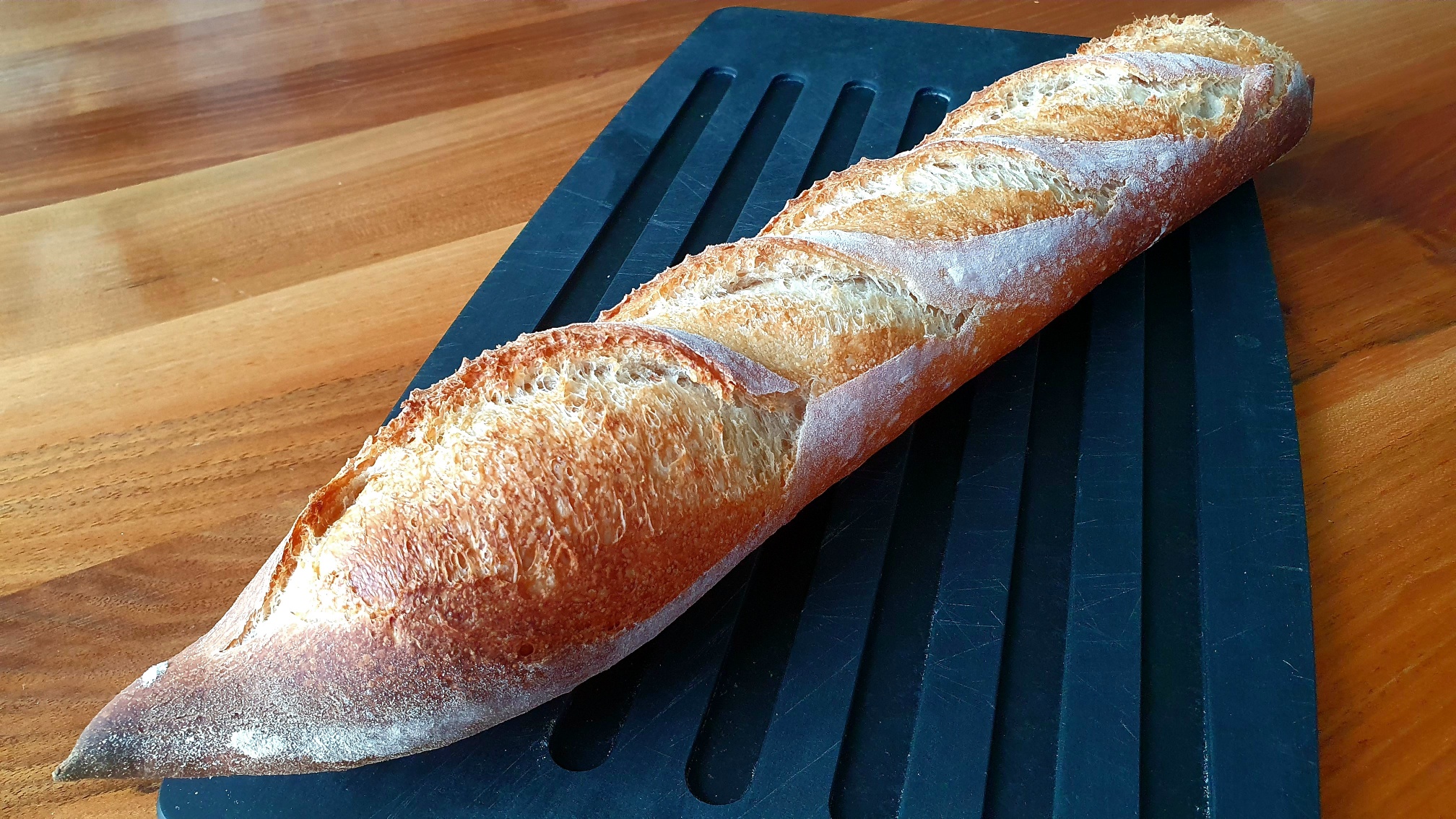 Nicht unwesentlich ist übrigens das Einschneiden der Baguette, damit sie sich beim Ofentrieb auch schön ausdehnen kann. Etwa drei bis fünf Schnitte von 1 cm Tiefe sollten es über die ganze Länge sein, jeweils zu einem Drittel überlappend, sehr spitzwinklig geschnitten, also beinahe in Richtung der Längsachse.