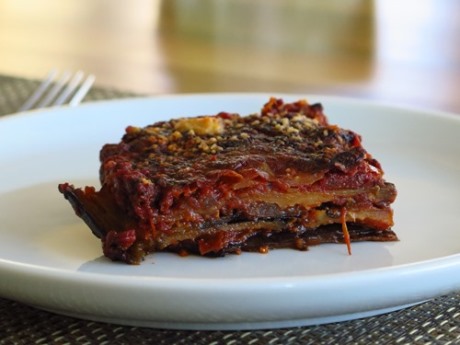 Für den Auberginen-Teil dieses Gerichts verfahre ich wie weiter unten im Zusammenhang mit Parmigiana di melanzane beschrieben: auf einem einzigen Gitterrost für den Ofen schaffe ich drei ganze Auberginen auf einmal. Das Gemüse in ca. 15mm dicke Scheiben schneiden, mit Olivenöl einpinseln, salzen, eine Lage auf Backpapier ausbreiten und ab damit in die oberen Gefilde des Ofens auf Grillstufe, bis sie schön braun sind. Dann kehren und nochmals für 10 Minuten in den Ofen.