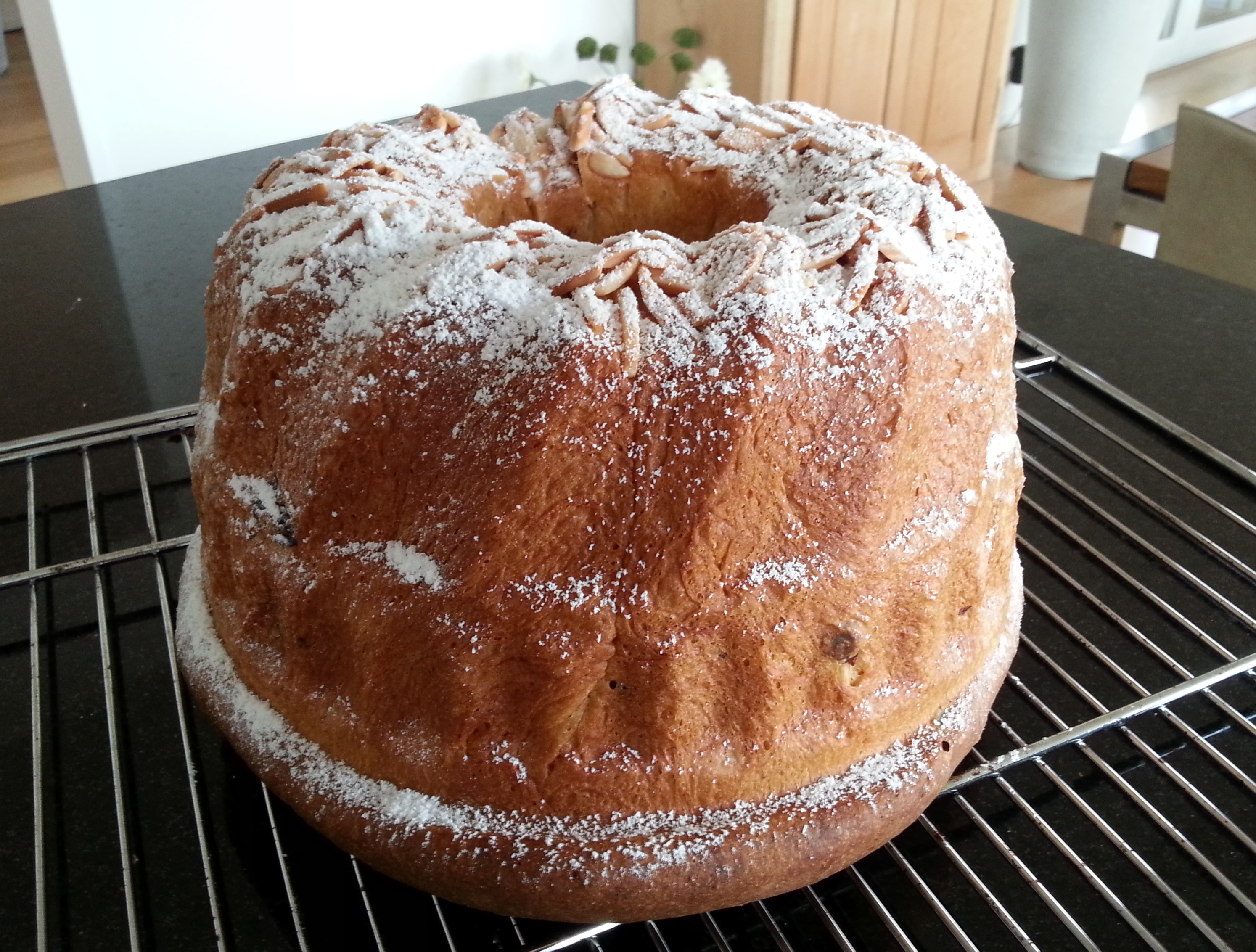 Der Elsässer, so wird er auch genannt. Ist seines Zeichens ein mit Butter reichlich ausgestattetes Hefegebäck, mit in Gewürztraminer oder Höherprozentigem eingelegten Rosinen bestückt und mit Mandeln verziert. Und schmeckt einfach yummy. Muss aber schnell gegessen werden.