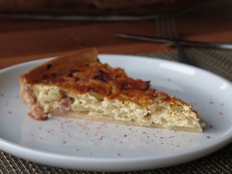 Also habe ich mich kundig gemacht und beim Durchlesen des Rezepts festgestellt: die praktisch gleichen Komponenten wie beim Flammkuchen. Teigboden, Crème fraîche, Zwiebeln, Speck. Im Vergleich zum Flammkuchen wird bei der Bölletünne ein Butterkuchenteig verwendet, ein x-faches an Zwiebeln kommt drauf und ein Eierguss deckt das Ganze zu. Die Konsistenz der beiden Geschwister ist unterschiedlich, der Geschmack identisch.