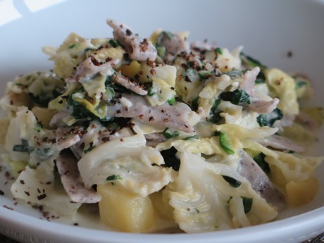 Seit ich der Sache auf den Grund gegangen bin, mache ich die Pizzoccheri nach Veltliner Art – zumindest mehr oder weniger. Die Bibel der italienischen Küche, die „Accademia della Cucina Italiana“, die ich schon für das „Ragù alla bolognese“ zu Rate gezogen hatte, erlaubt anstatt Wirz auch Krautstiel. Soll mir recht sein. Einem faden Veltliner Käse jage ich mit Sicherheit nicht nach, nur um Authentizität zu beanspruchen, und auch beim Salbei entscheidet mein Gusto: mal mit, mal ohne. Als ich in einem Laden in Livigno dann auch noch Buchweizenmehl fand (bis jetzt hatte ich immer die getrockneten Pasta verwendet), war der Entschluss schnell gefasst: machen wir beim nächsten Mal auch noch die Nudeln selber.